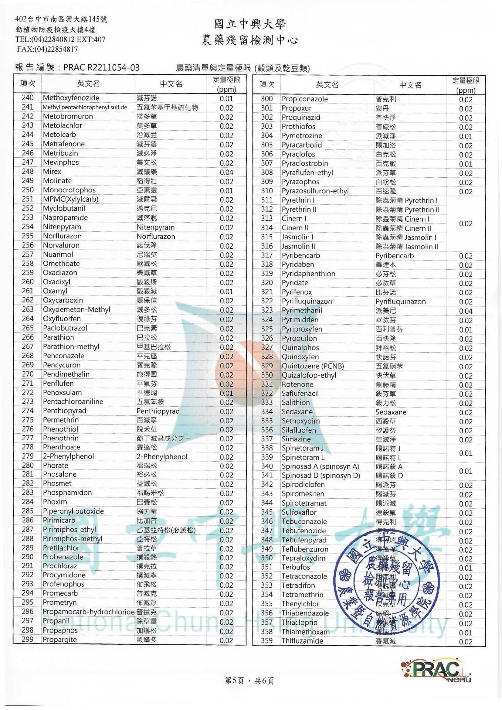 380種農藥項目如下,表內所列定量極限適用於殼類及乾豆類