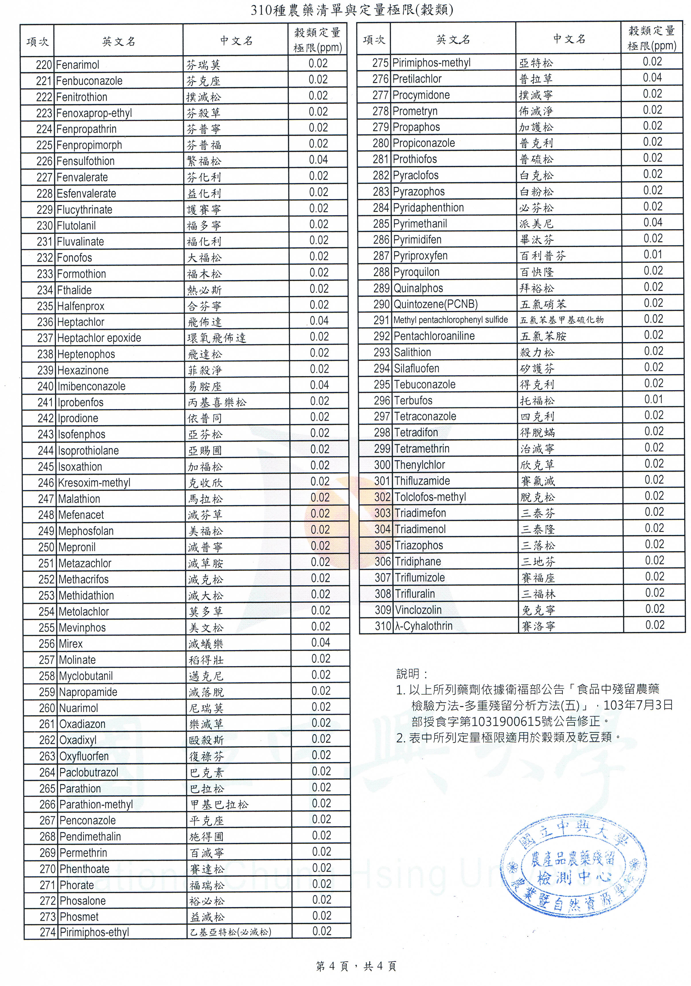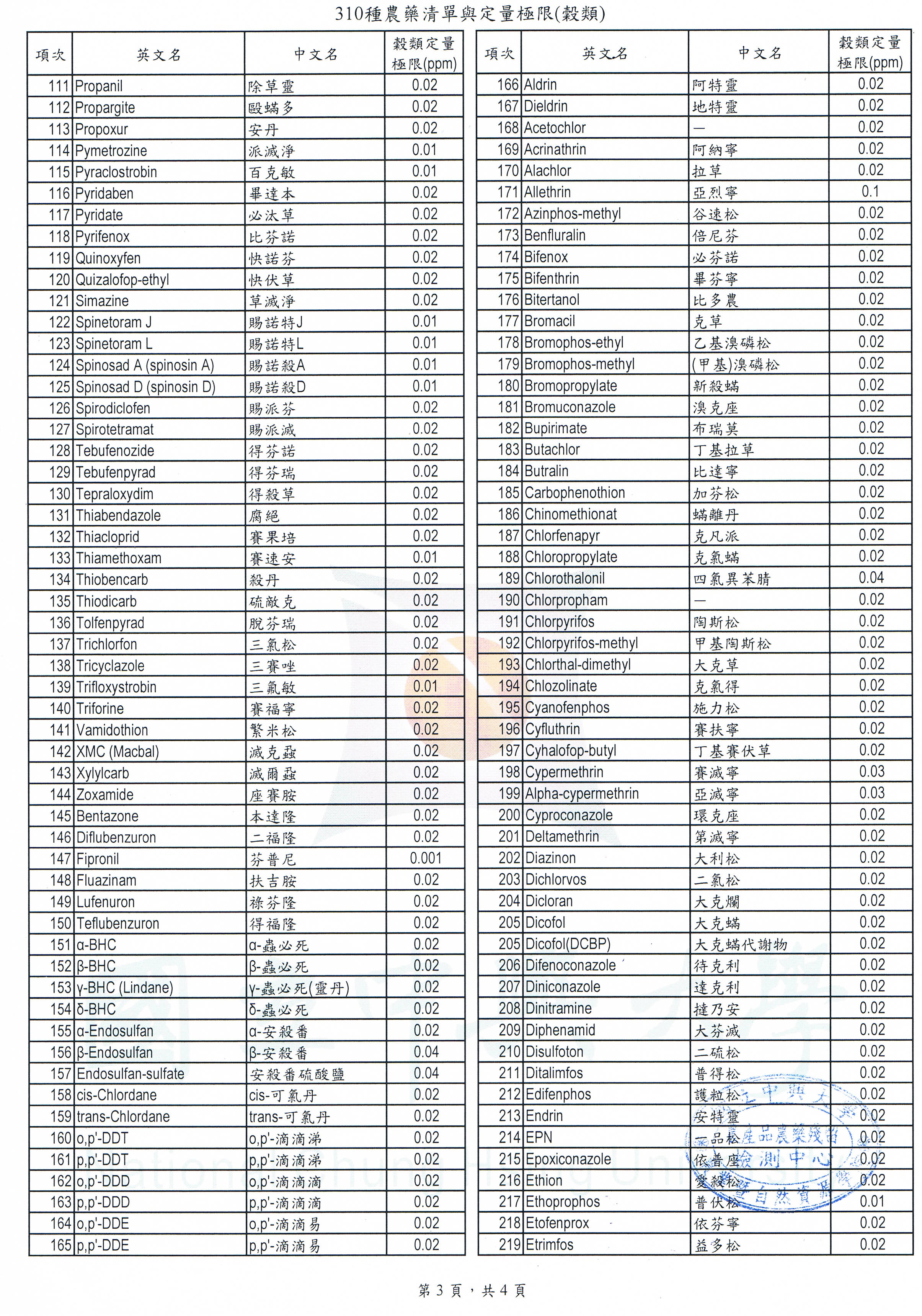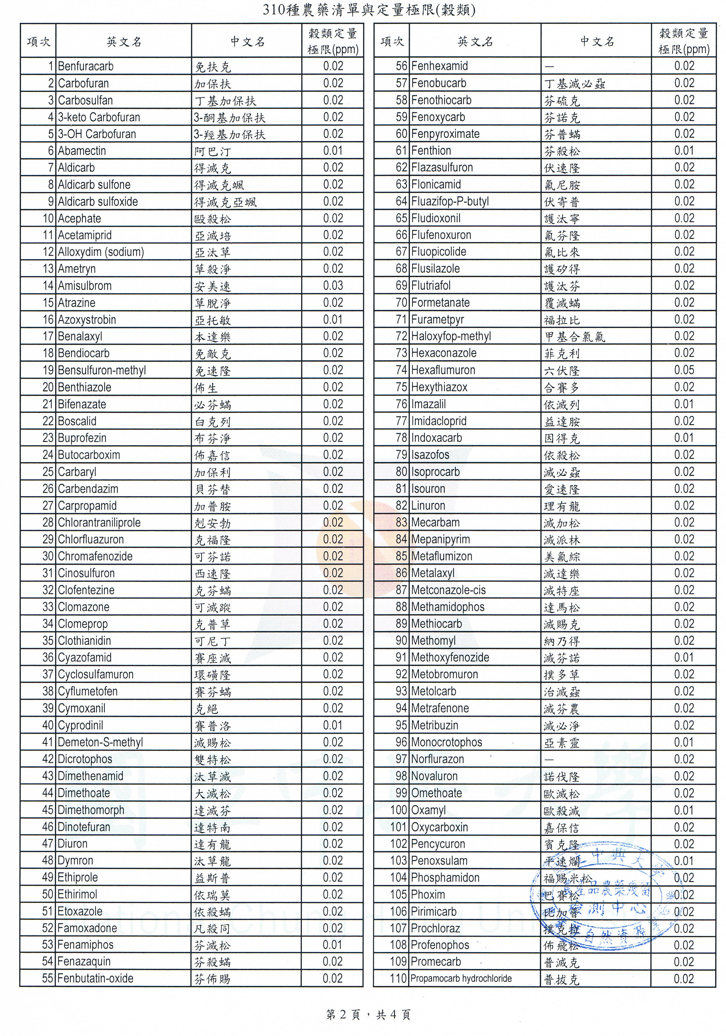 310種農藥項目如下,表內所列定量極限適用於殼類及乾豆類