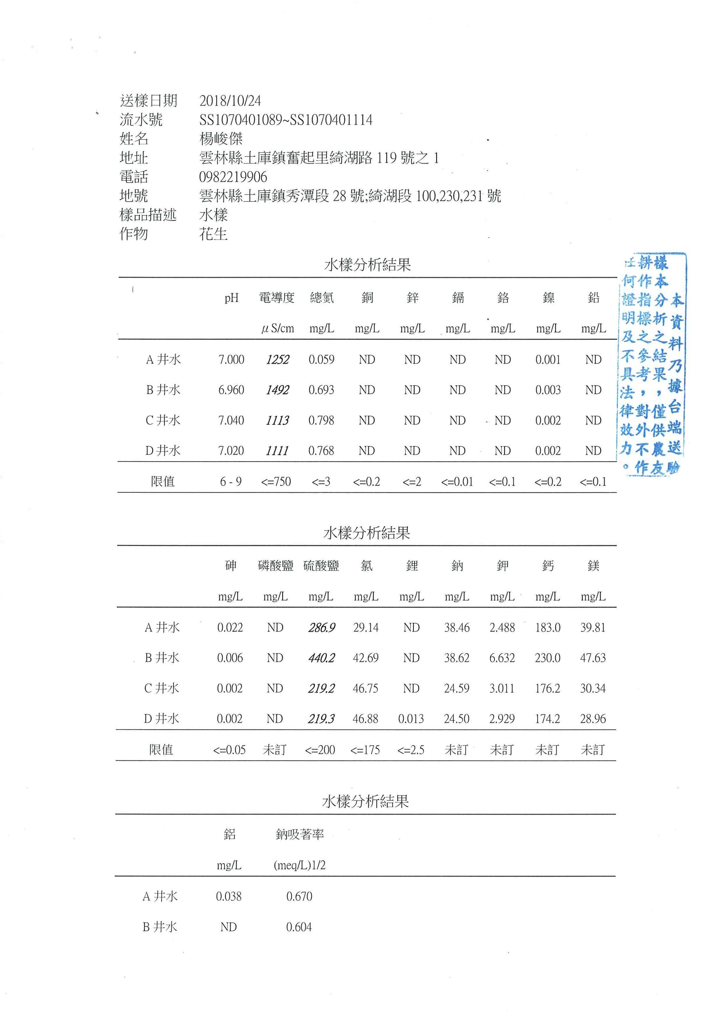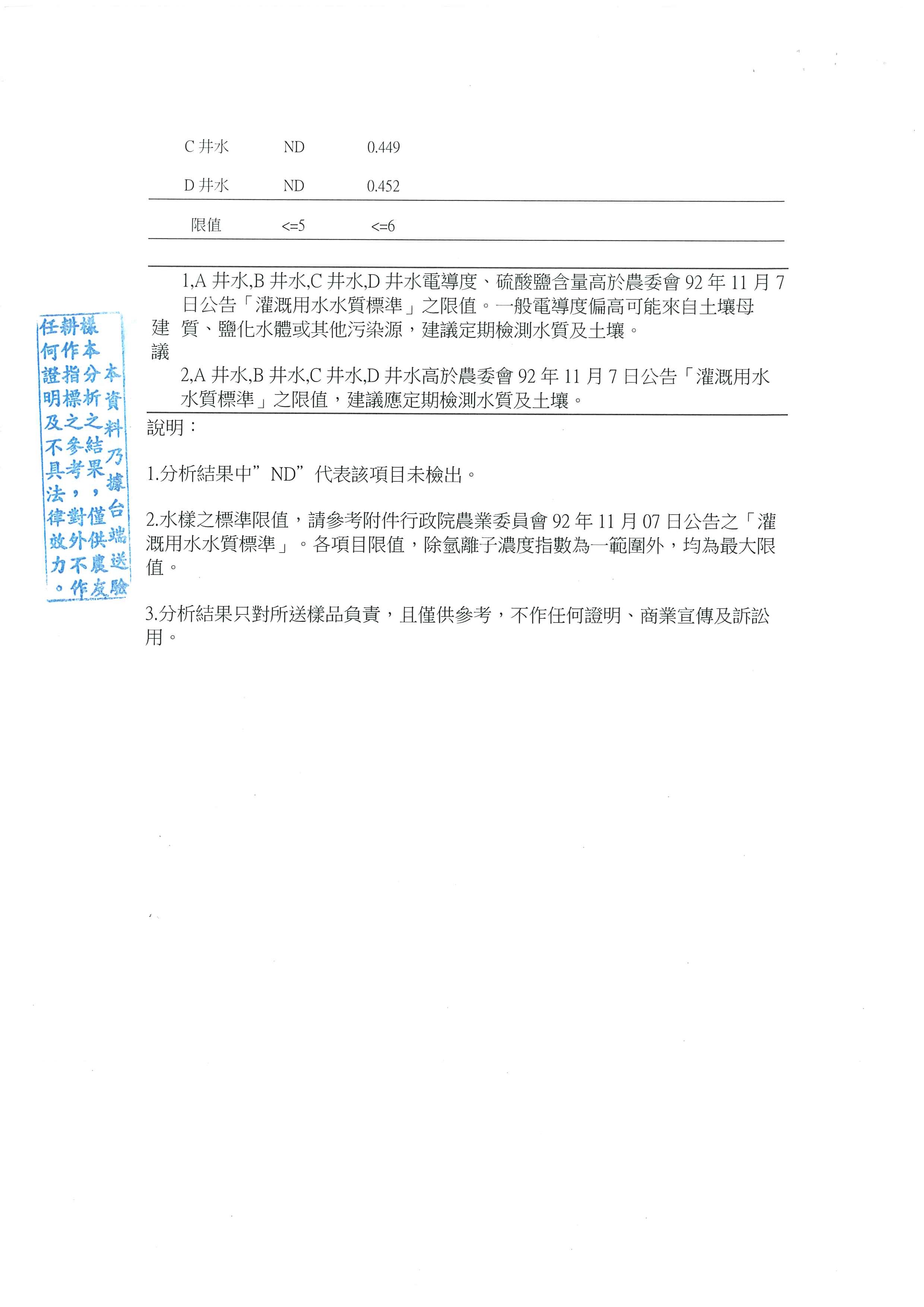 2018的灌溉用井水重金屬檢驗,確定長期使用的井水沒有重金屬過標的情況。