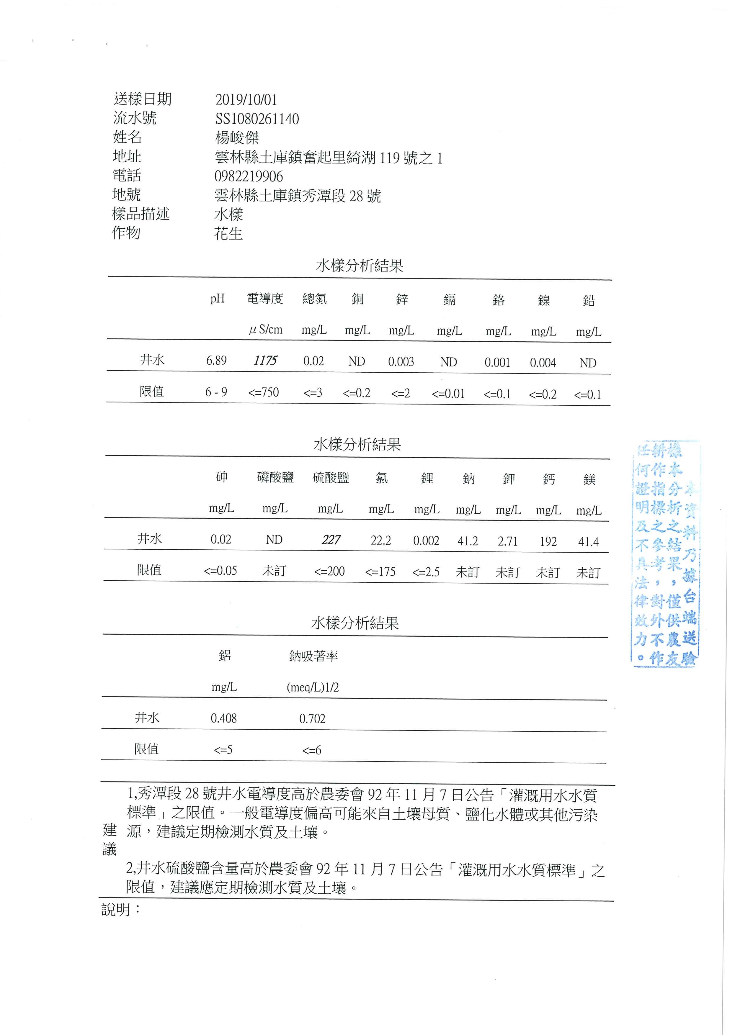 2019的灌溉用井水重金屬檢驗,確定長期使用的井水沒有重金屬過標的情況。