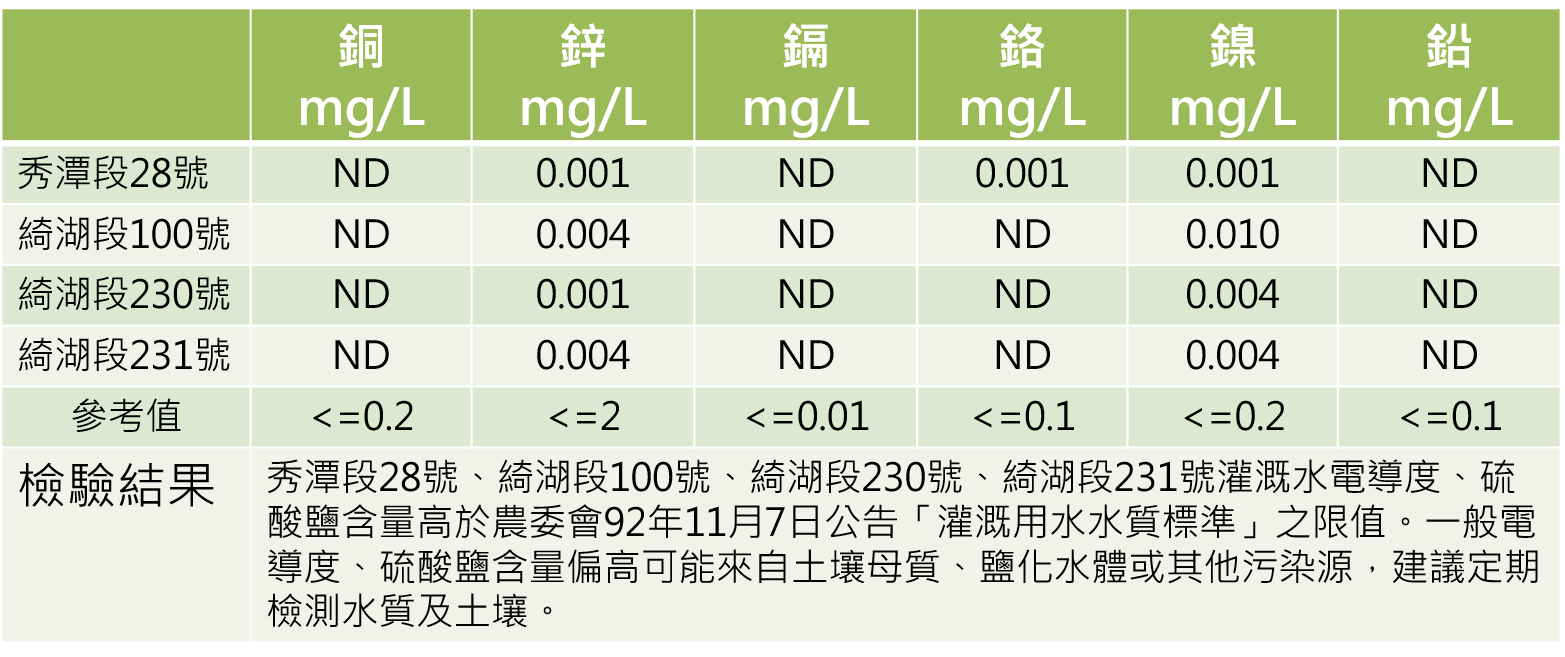 今年的四塊農地都出現些許的鎳與鋅,秀潭28號地段,同時也出現其它重金屬數值(鉻),不過量也是在安全值內,農舍明年也會再送驗,以確保水源的安全。